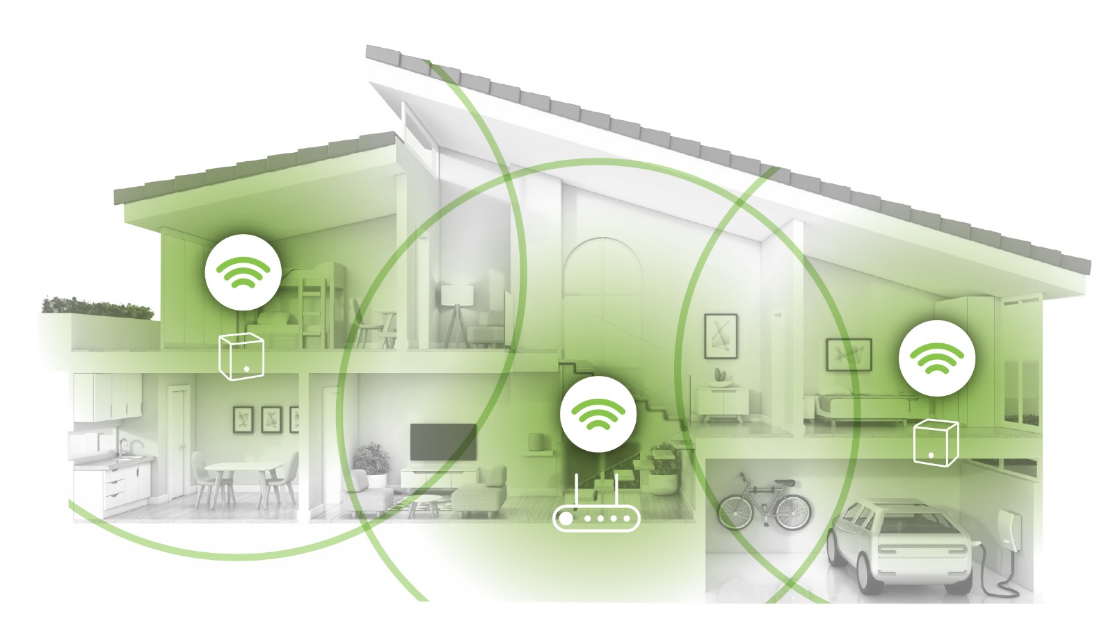 Os roteadores ficam conectados via cabo, e de uma forma inteligente criam uma super cobertura de sinal em toda residência. Dessa forma o seu dispositivo (celular, TV, tablet, notebook ou qualquer outro dispositivo que funcione com o sinal Wi-Fi) identifica qual dos roteadores tem o melhor sinal no cômodo em que você se encontra.